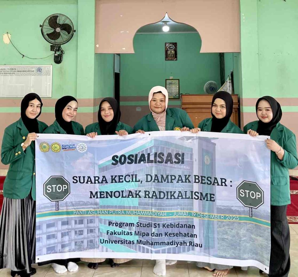 KABARLAH.COM, PEKANBARU– Mahasiswa Universitas Muhammadiyah Riau (UMRI), Fakultas MIPA dan Kesehatan, Program Studi S1 Kebidanan, menggelar kegiatan Sosialisasi dengan tema Radikalisme yang berjudul “Suara Kecil, Dampak Besar: Menolak Radikalisme” di Panti Asuhan Putra Muhammadiyah pada Jumat, 19 Desember 2025, sekitar pukul 13.30 WIB.