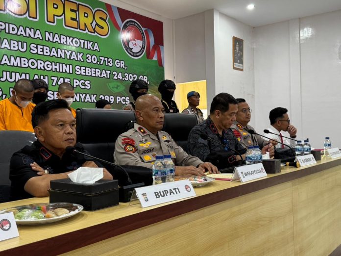 Kapolres merincikan hasil barang bukti yang berhasil disita diantaranya sebanyak 30.713,7 gram sabu dalam kemasan teh hijau “Chinese Tea”, 24.302,4 gram cairan Happy Water Lamborghini.
