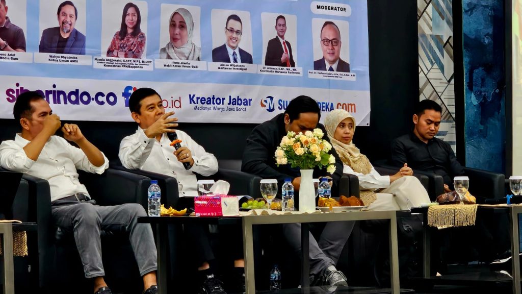 Diskusi dipandu oleh Prof. Dr. Taufiqurachman, A.Ks., Sos., M.Si, dengan menghadirkan sejumlah narasumber dari berbagai latar belakang, antara lain Prof. Dr. H. Yuddy Crisnandi, S.E., M.E (Ketua Dewan Pakar SMSI Pusat), Nuzula Anggerain (Direktur Ideologi, Kebangsaan, Politik, dan Demokrasi Kementerian PPN/Bappenas), Hersubeno Arief (praktisi media baru), Wahyu Dhyatmika (Ketua Umum AMSI), Ilona Juwita (Wakil Ketua Umum SMSI), Aiman Witjaksono (wartawan senior), serta Dr. Ariawan, S.AP., MH., MA (Koordinator Wartawan Parlemen).