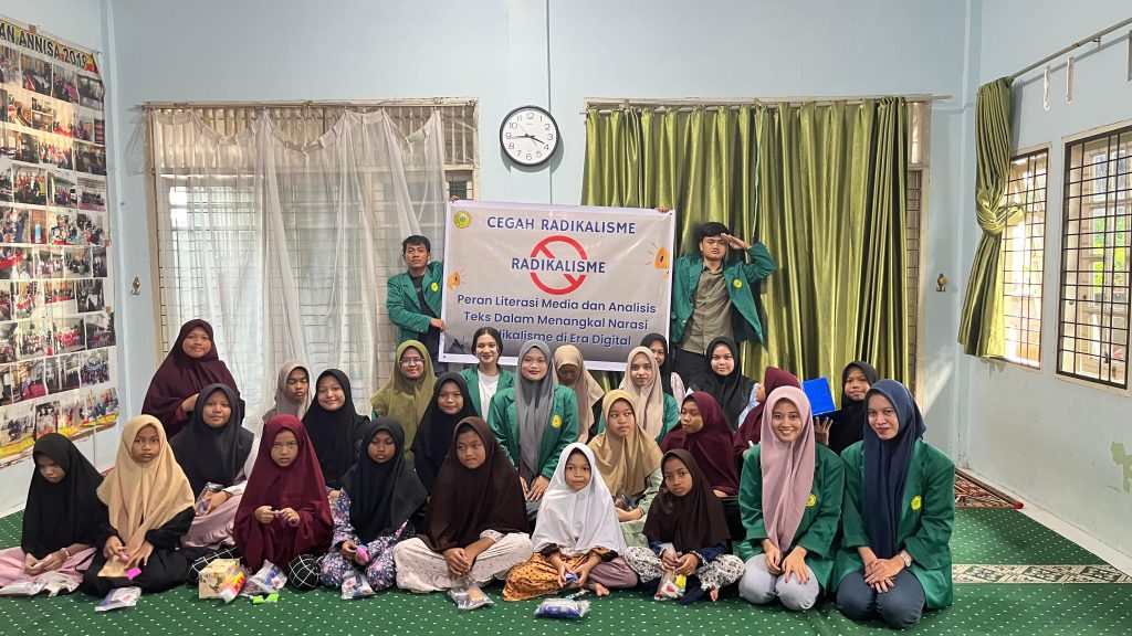 Mahasiswa tersebut menyampaikan materi mengenai pentingnya literasi media dan analisis teks dalam menangkal narasi radikalisme di era digital. Dengan kemampuan menganalisis informasi yang diterima dari media sosial, individu dapat mengidentifikasi konten yang berpotensi radikal dan mengambil tindakan untuk menghindari atau melaporkannya.