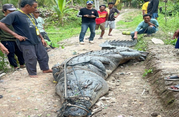 KABARLAH.COM, Inhil – Warga Desa Sungai Undan, Kecamatan Reteh, Kabupaten Indragiri Hilir (Inhil) dihebohkan dengan kemunculan seekor buaya berukuran raksasa pada Jumat (31/10/25). Hewan liar dilindungi itu diperkirakan memiliki panjang sekitar 7 meter dengan berat mencapai hampir 1 ton.