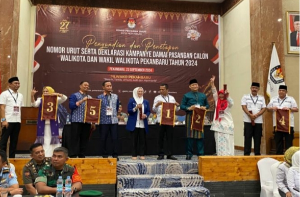 Pengumunan nomor urut tersebut, dilakukan KPU Pekanbaru usai menetapkan Lima (5) Paslon Walikota dan Wakil Walikota Pekanbaru yang dinyatakan telah memenuhi syarat dan ditetapkan sebagai calon peserta Pilkada 2024, pada Rapat Pleno Tertutup, Ahad (22/09/2024).