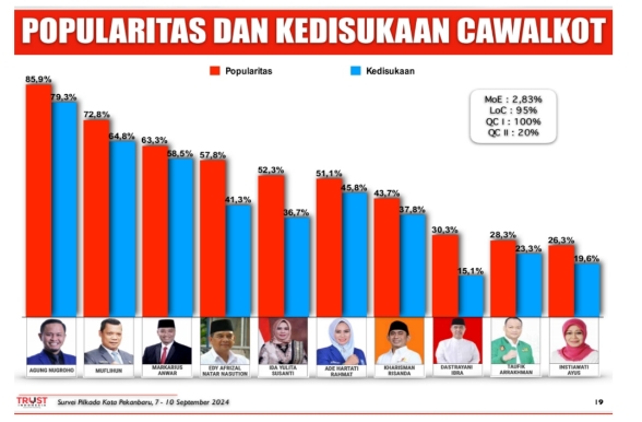 Untuk mengetahui elektabilitas pasangan calon Walikota dan Wakil Walikota Pekanbaru, Lembaga survey Trust Indonesia merilis hasil survei elektabilitas calon Walikota dan Wakil Walikota Pekanbaru. Dalam survei yang dilakukan pada rentang waktu tanggal 7-10 September 2024, pasangan calon Agung Nugroho dan Markarius Anwar menduduki posisi teratas, menunjukkan tingkat elektabilitas yang paling tinggi di antara calon-calon lainnya.