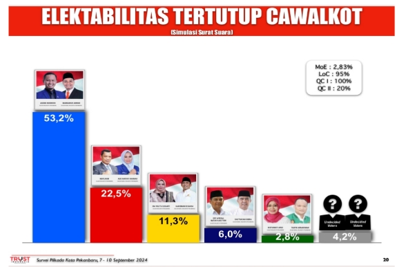 Untuk mengetahui elektabilitas pasangan calon Walikota dan Wakil Walikota Pekanbaru, Lembaga survey Trust Indonesia merilis hasil survei elektabilitas calon Walikota dan Wakil Walikota Pekanbaru. Dalam survei yang dilakukan pada rentang waktu tanggal 7-10 September 2024, pasangan calon Agung Nugroho dan Markarius Anwar menduduki posisi teratas, menunjukkan tingkat elektabilitas yang paling tinggi di antara calon-calon lainnya.